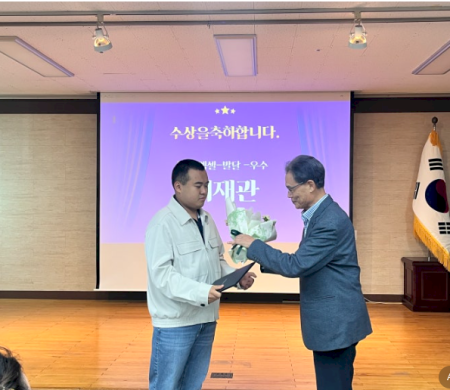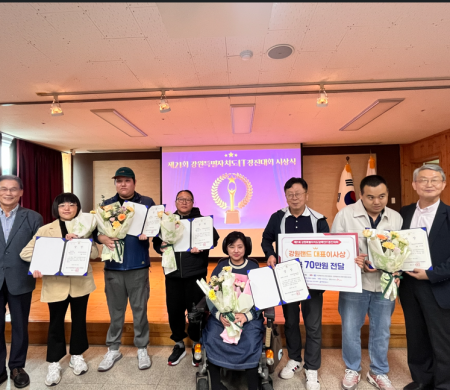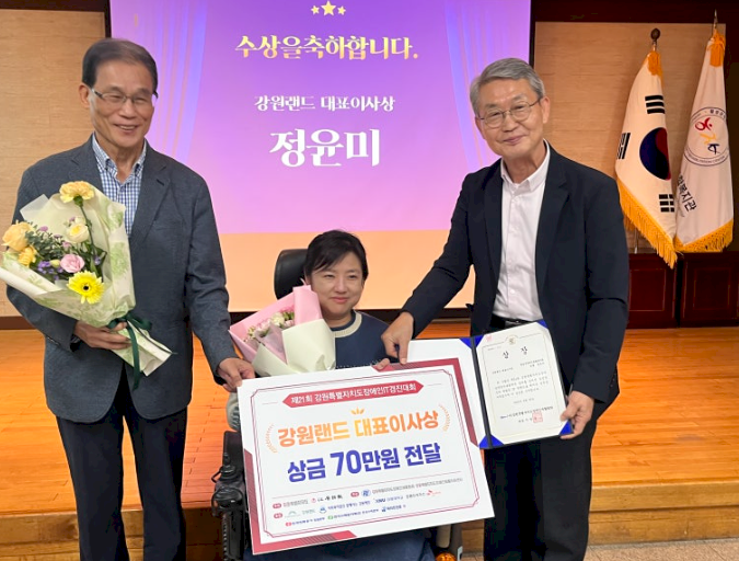 이번 시상식은 강원도특별자치도장애인재활협회 이방웅 회장님을 비롯한 직원분들이 직접 복지관을 방문하여 상장과 상금 그리고 꽃다발을 수여해주셨습니다. 박성길관장님과 횡성군장애인종합복지관 직원들 그리고 많은 이용자들이 자리를 빛내주셨답니다.