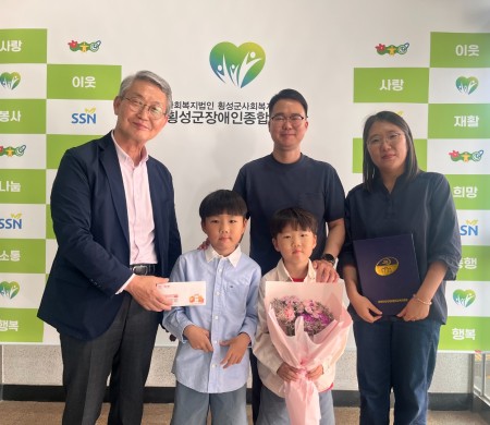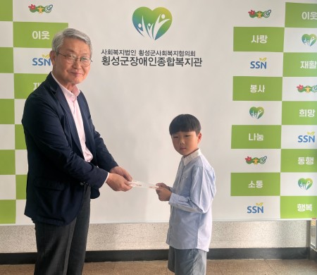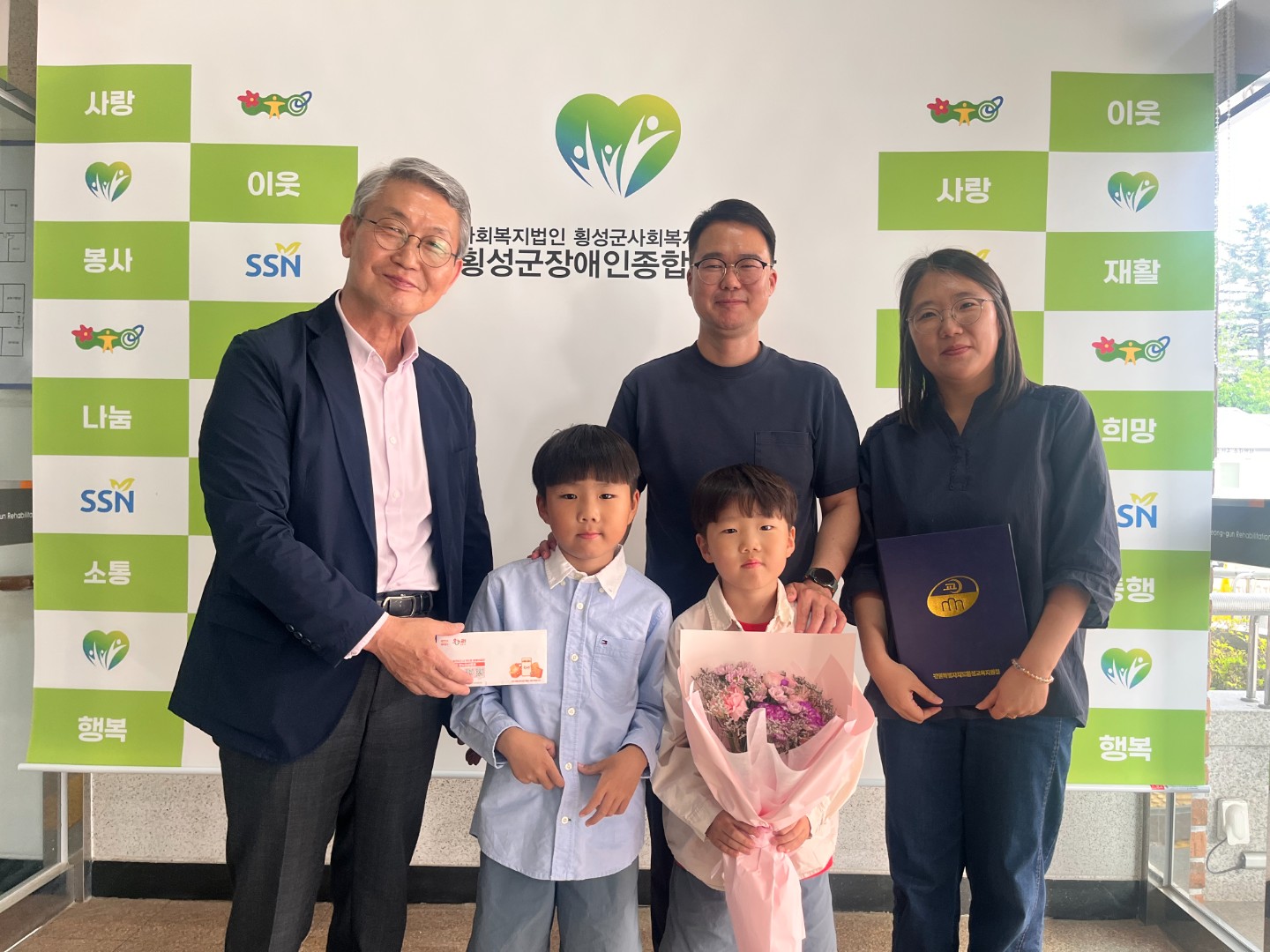 5월 22일(목)에 진행된 2025년 장애인식개선 공모전 시상에서 초등부 최우수상을 수상한 횡성초등학교 김정윤 학생이 상금 20만원을 복지관에 후원해주셨습니다.
