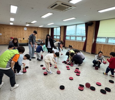아이들의 집중력 향상을 위해 연탄집게로 연탄을 집어 나르는 활동을 보호자와 함께 진행하면서