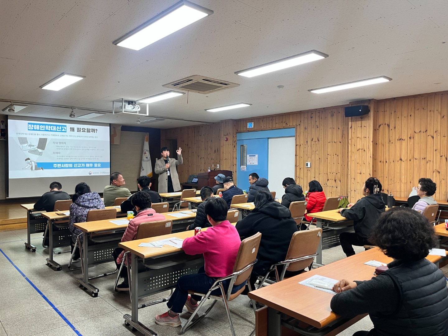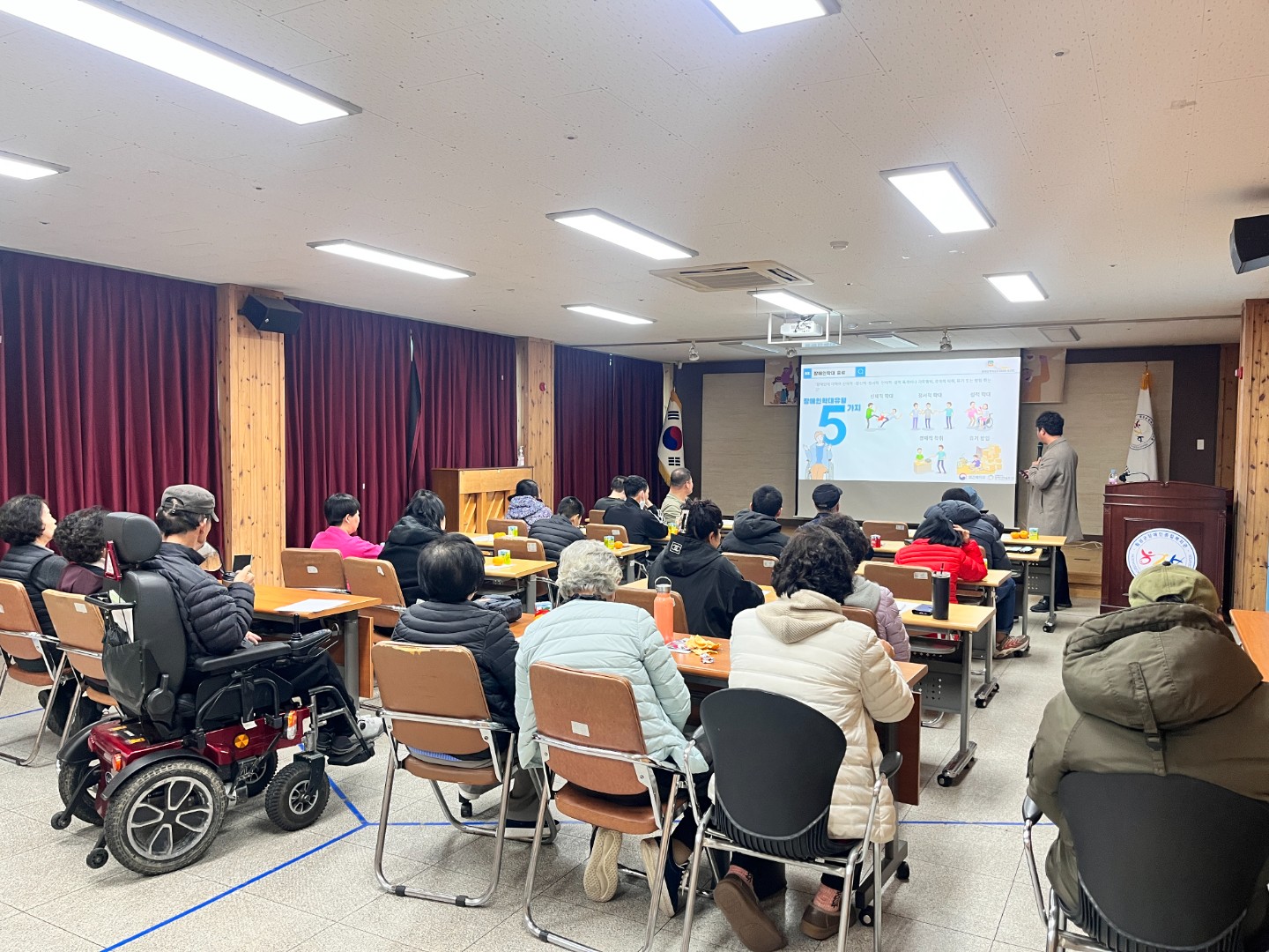 2025년 11월 27일(목), 제3차 열린강좌로 장애인권익옹호 「장애인학대예방교육」을 실시하였습니다. 이번 교육은 강원특별자치도장애인권익옹호기관에서 직접 오셔서 강의를 진행해주셨습니다. 지역 내 장애인과 비장애인 22명을 대상으로 이루어졌으며, 장애인 학대의 유형과 예방 방법, 학대 발견 시 신고 절차 등 실질적인 내용으로 구성되었습니다.